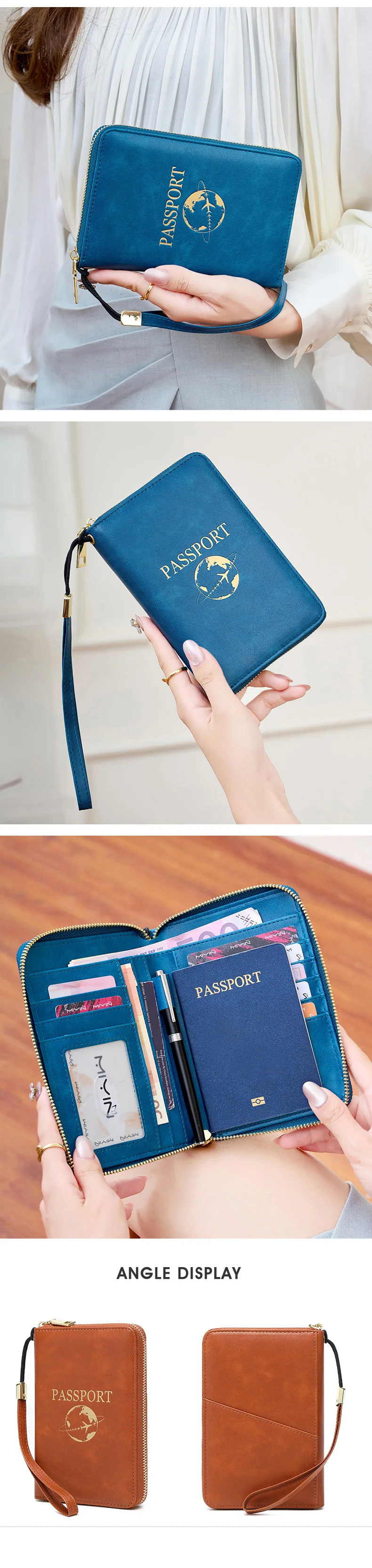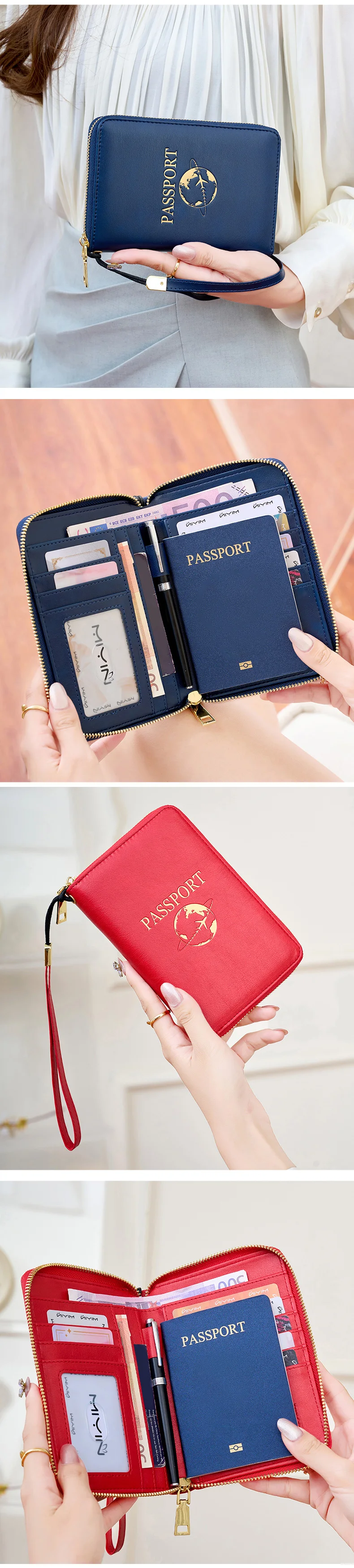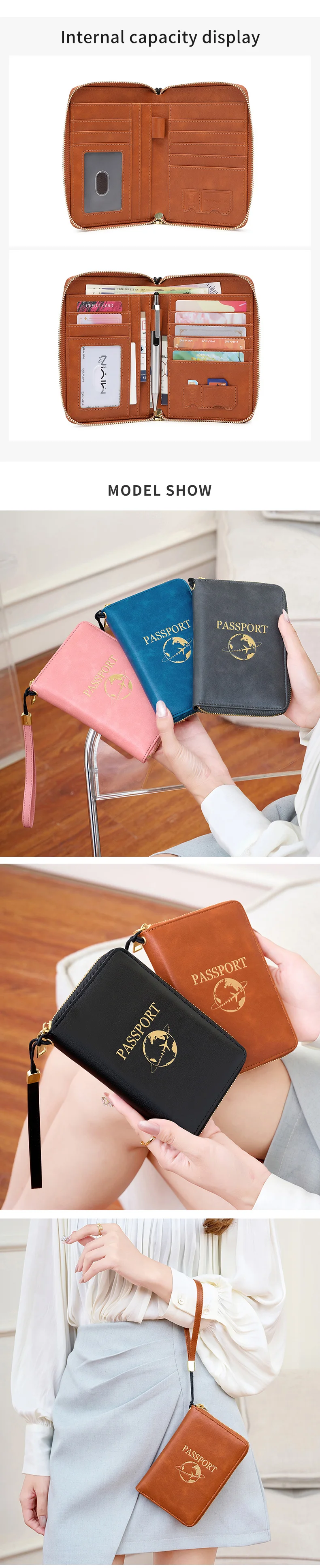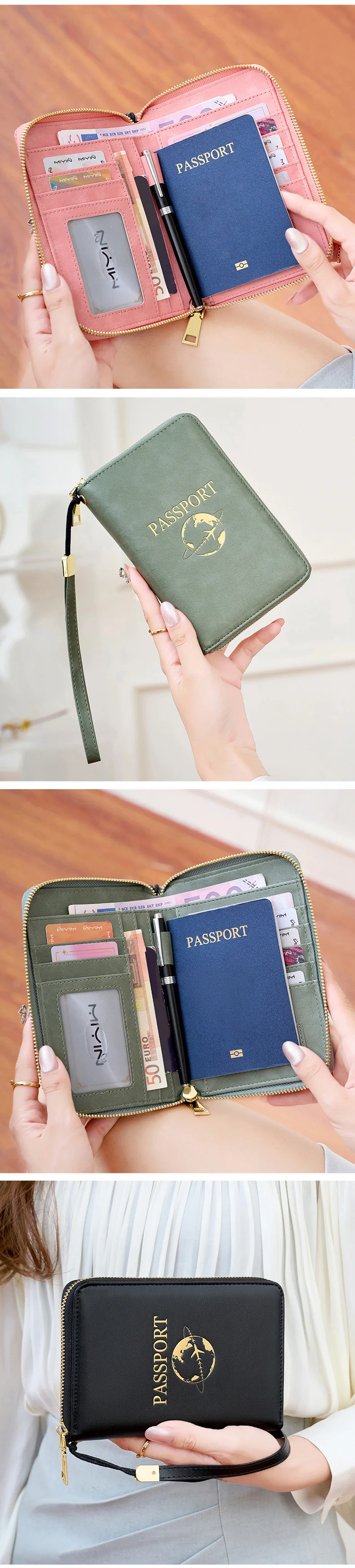 حامل جواز سفر يحجب RFID، محفظة سفر، جواز سفر، حقيبة بطاقات الائتمان، محفظة متعددة الوظائف بسحاب مع حزام معصم، موضة