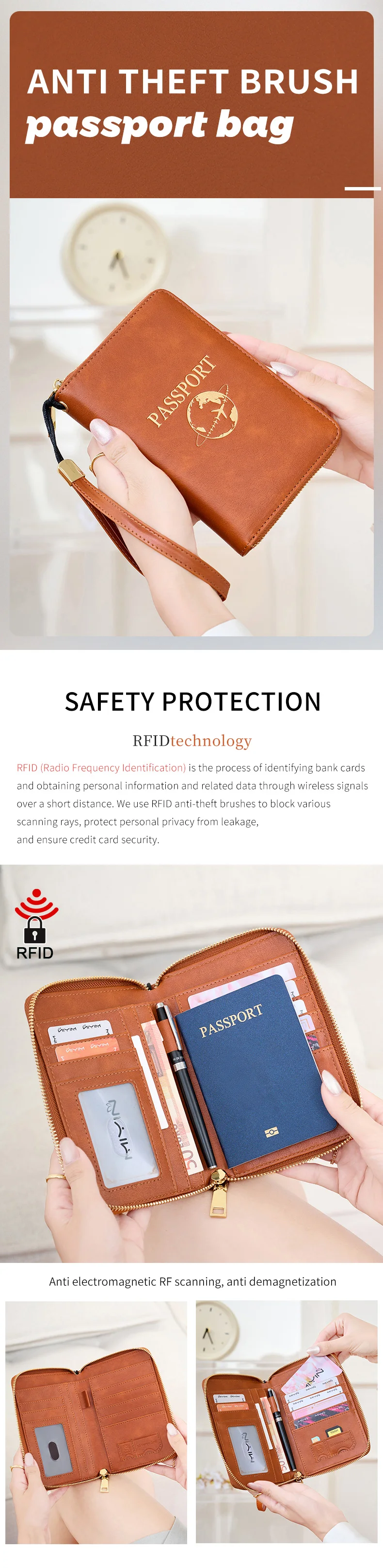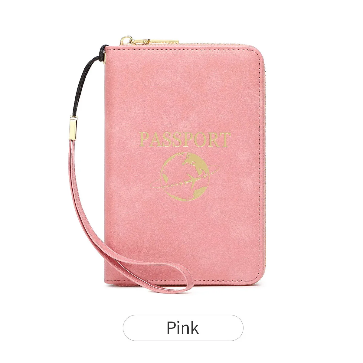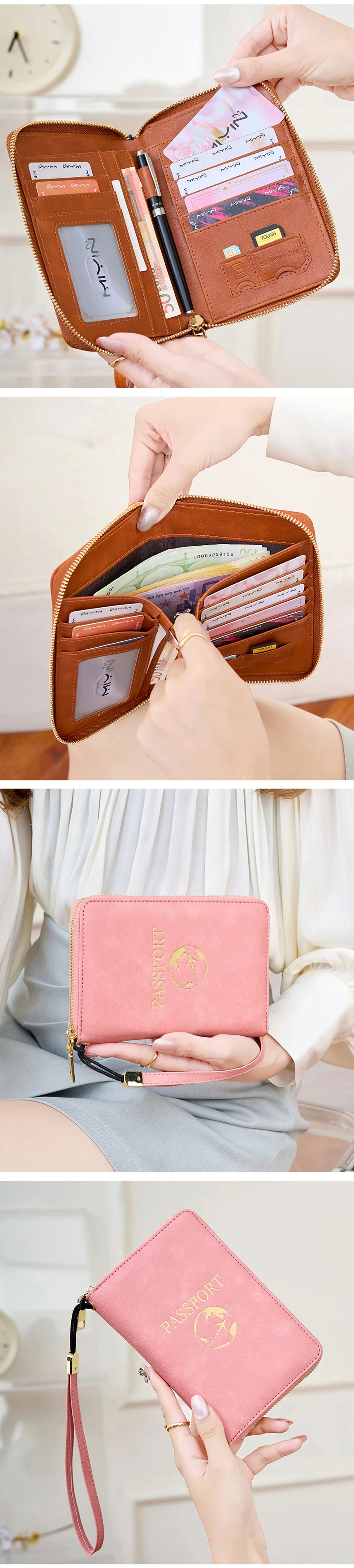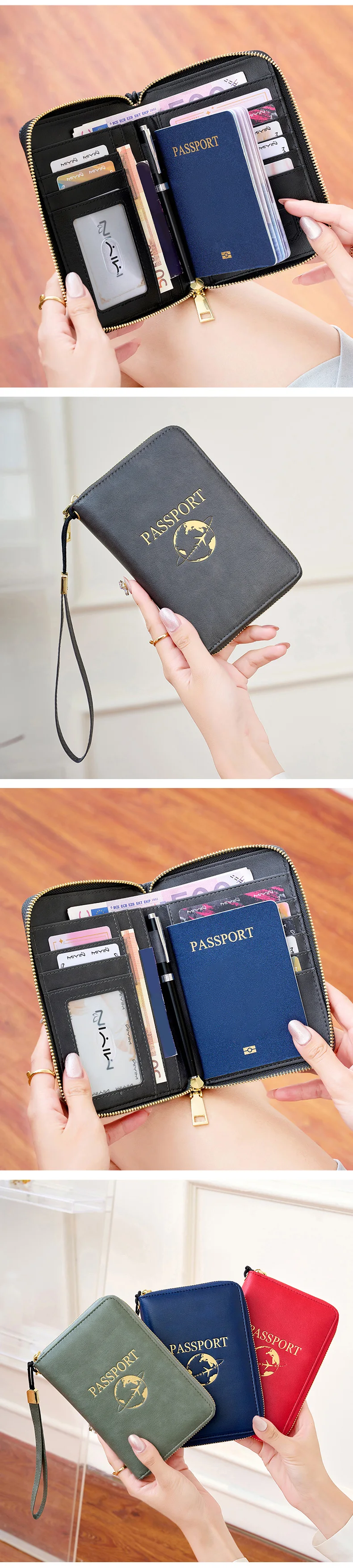 حامل جواز سفر يحجب RFID، محفظة سفر، جواز سفر، حقيبة بطاقات الائتمان، محفظة متعددة الوظائف بسحاب مع حزام معصم، موضة